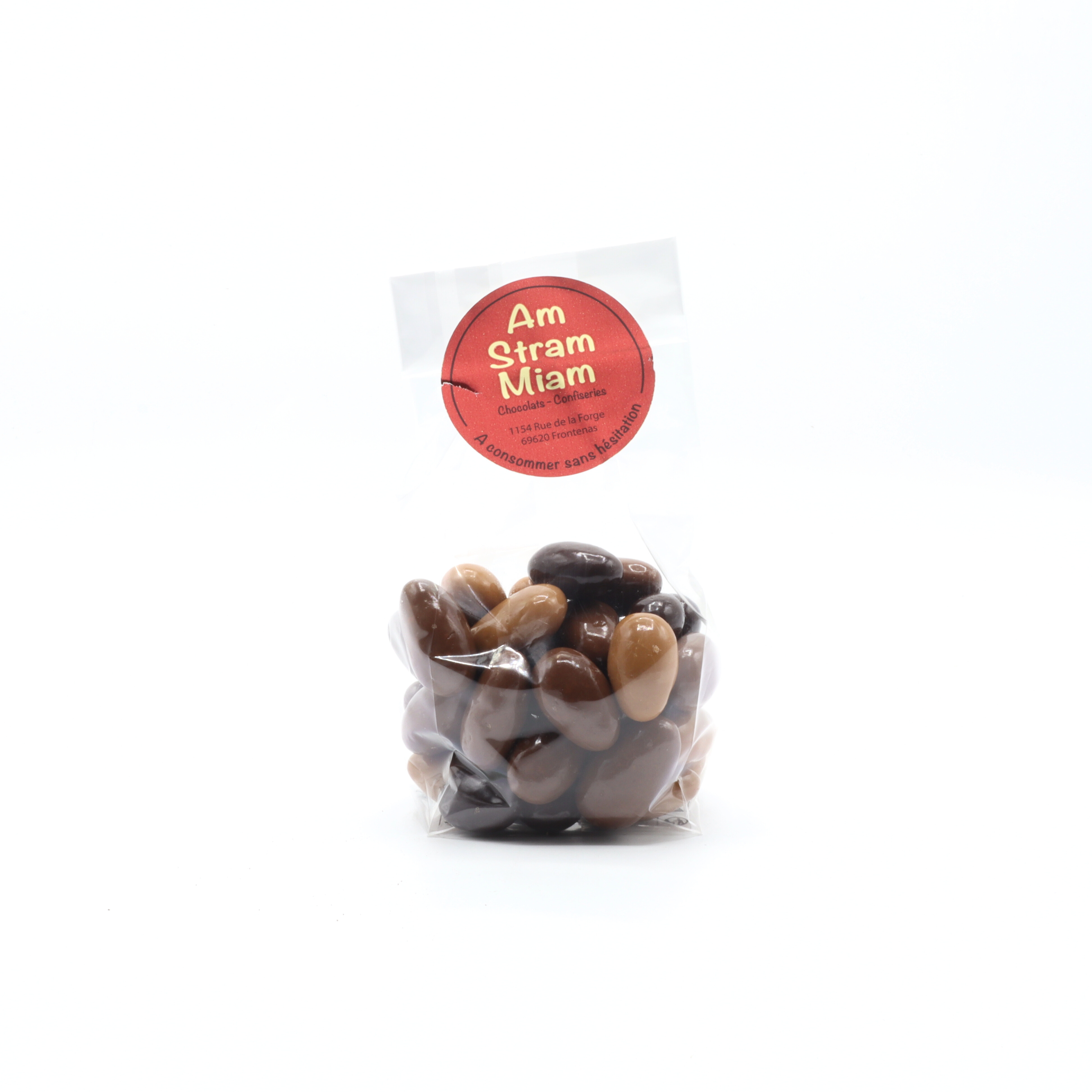 Amandes enrobées chocolat noir, lait et caramel – 150 g