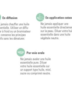 - En règle générale, nous déconseillons l’usage d’huiles essentielles pour les femmes enceintes ou allaitantes, les personnes épileptiques, les personnes hypersensibles ou présentant un cancer hormonodépendant, et plus généralement celles ayant des problèmes de santé. Sauf avis médical, n’utilisez pas d’huiles essentielles chez les bébés et les enfants de moins de 3 ans. Pour les enfants de plus de 3 ans, utilisez-les exclusivement sous contrôle médical.