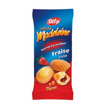 Succombez aux Madeleines fraise BIFA – 200 g, moelleux biscuits fourrés à la confiture de fraise, disponibles facilement en ligne avec une livraison rapide et fiable partout en Algérie via echrily courses.