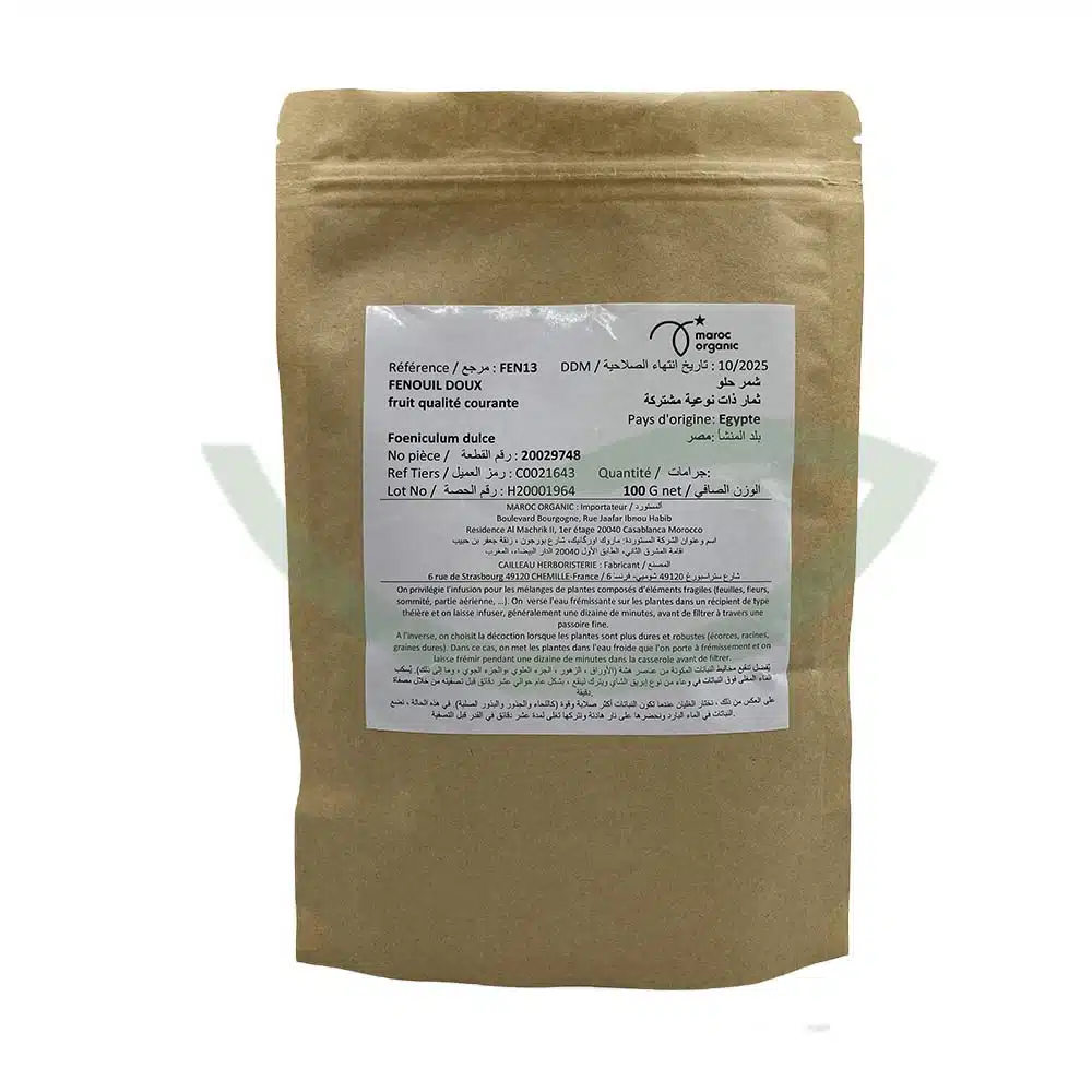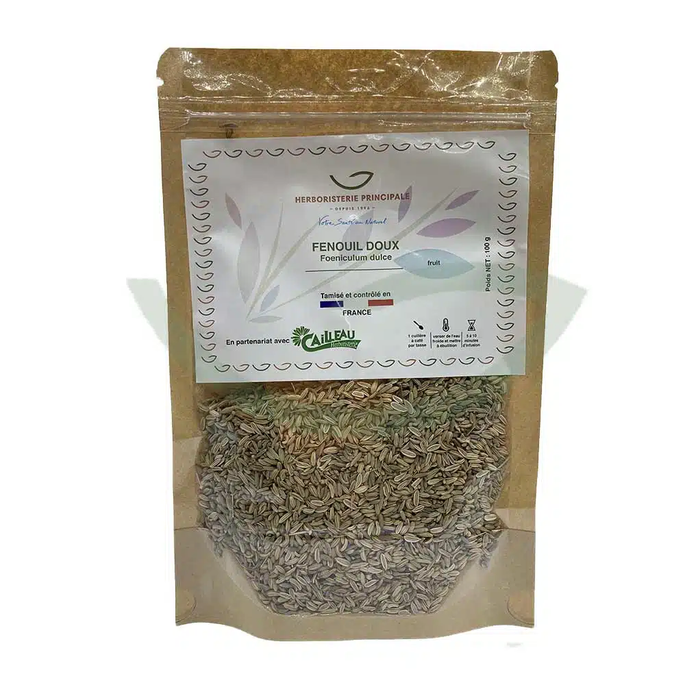 Le fruit de fenouil doux est une plante médicinale pure et naturelle traditionnellement utilisée pour ses propriétés digestives, hormonales et diurétiques. Riches en anéthol, ses graines soulagent les troubles digestifs (constipation, diarrhée, flatulences) et les ballonnements et favorisent la bonne digestion après un repas, également efficace contre les coliques des nouveau-nés et enfants. Ces graines permettent également de réguler les hormones féminines, de soulager les bouffées de chaleur pour les femmes ménopausées et de soulager les crampes menstruelles pour les femmes en période de menstruations, et de favoriser la production de lait maternel grâce à son action galactogène. Diurétiques, elles favorisent aussi l’élimination des toxines et des excès d’eau et possèdent un pouvoir drainant lymphatique.