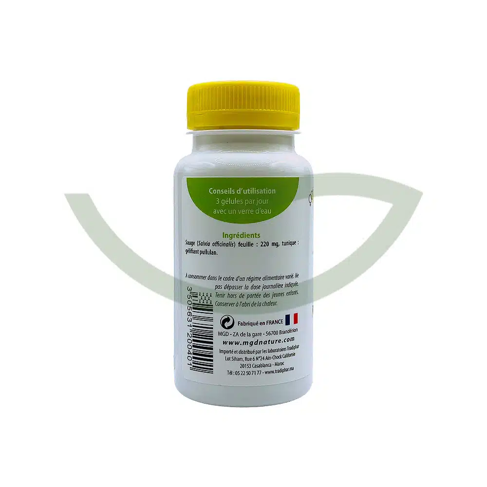 – Sauge (Salvia officinalis) feuille : 220 mg, tunique : gélifiant hydroxypropylméthylcellulose.