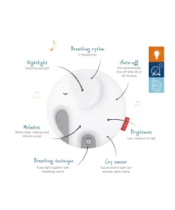 - Adaptation automatique de l’enfant au rythme et bercement plus facile par l’écoute des sons de respiration et l’observation de la lumière grandissante et atténuante