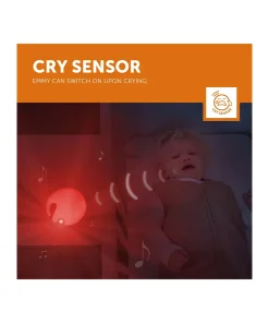 Emmy est équipée d’une veilleuse rouge apaisante. La lumière rouge est la meilleure couleur pour une veilleuse car elle ne perturbe pas la production de mélanine. Votre enfant s’endort plus facilement en suivant le rythme du bruit de la respiration et de la lumière qui grossit et diminue. Vous pouvez également écouter un bruit blanc ou une boucle de berceuses apaisantes. La lumière s’allume automatiquement lorsque votre enfant pleure et s’éteint automatiquement une fois que votre enfant s’est endormi.